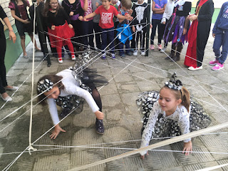 En el taller de la tela de araña se trataba de pasar por debajo intentando no rozar el elástico que el maestro Paco había preparado.....